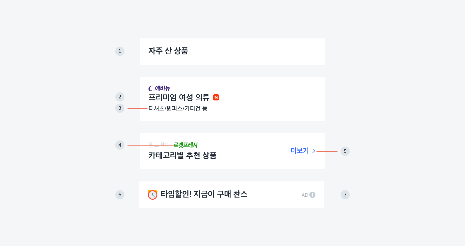 1. 컨테이너 2. 타이틀 3. 보조 타이틀 4. 로고 및 배지 5. 버튼 6. 아이콘 7. 애드마커