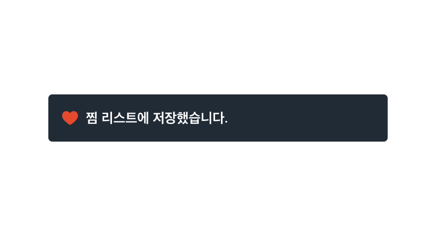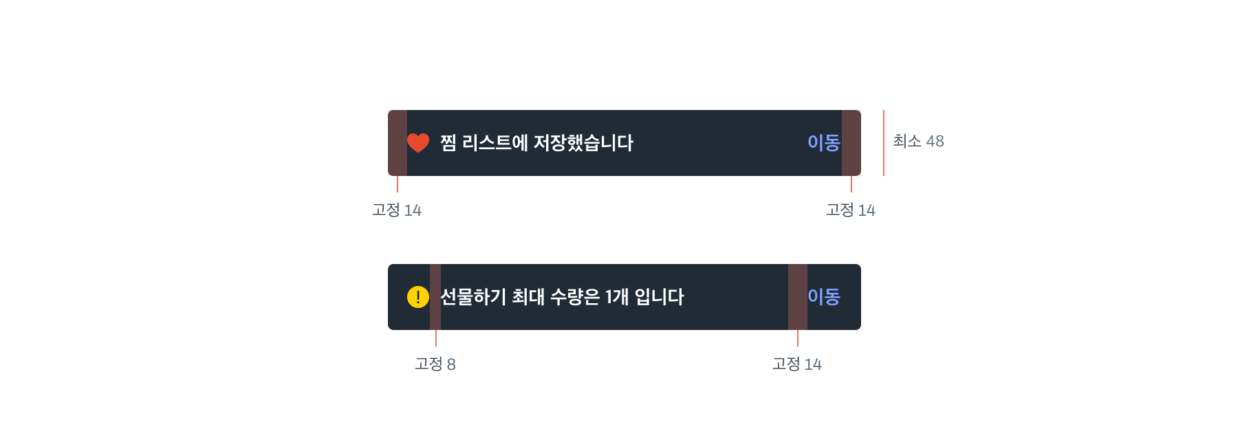 | Snackbar | 수량 피커, 찜하기 버튼, 장바구니 바로담기(Quick Add to Cart)버튼 등을 눌렀을 때와 같이 고객 행동에 관한 피드백을 일시적으로 안내할 때 사용합니다. | 일시적으로 노출된 뒤 자동으로 사라집니다. |