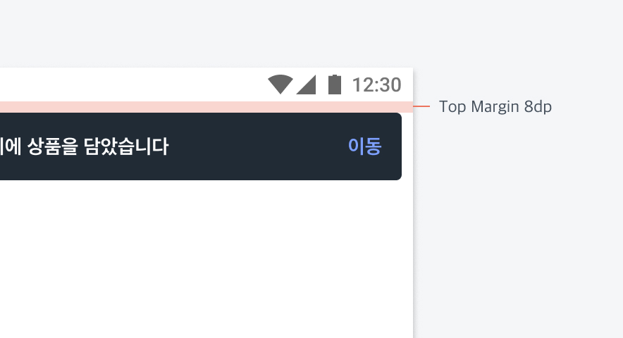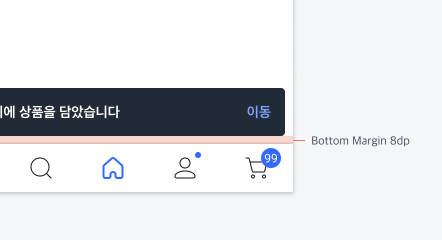 단, 화면 맨 아랫부분에 하단 네비게이션 바(GNB)가 있을 때는 스낵바를 GNB 영역 바로 위에 배치합니다.
